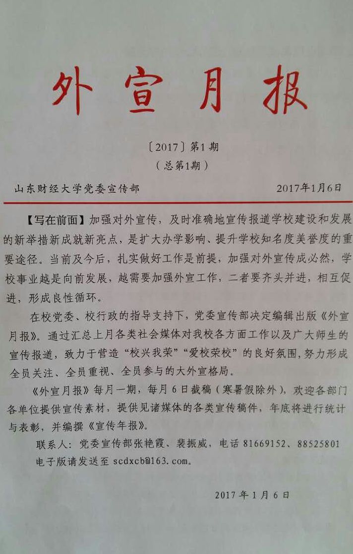 首期《外宣月报》设有“学习全国高校思想政治工作会议精神专题”“工作传真”“财大学人”“学子风采”“省教育厅选用工作信息”“微信 微博”等六个版块,汇总了2016年12月及今年1月初相关社会媒体对我校的宣传报道,近50篇(条),共6页。