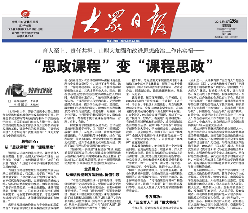 育人润物细无声。“经济学学科中关于马克思主义政治经济学原理,管理学中关于人的大局观、系统思维、组织文化等,都影响着大学生的政治信念、人生理念和生活态度,需要深挖其中的育人资源、育人元素和育人逻辑。授人以鱼,还要授人以渔。加强高校思政工作,没有最好只有更好,人人需尽责,没有旁观者。我们将紧扣高素质财经人才培养实际,把思政工作贯穿育人全程,齐上阵齐动手,一盘棋一条心,构建大思政育人格局,在培育山财大思政特色方面用心用力用功,交出新时代高校思想政治工作的合格答卷。”王邵军说。