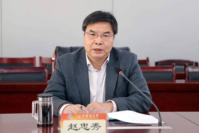 赵忠秀在讲话中首先向为疫情防控工作做出辛勤努力的每一位师生员工表示衷心的感谢和崇高的敬意。他从9个方面对2019年工作进行了总结。一是综合改革深入推进,高质量发展全面提速;二是坚定立德树人目标,人才培养质量大幅提升;三是第二课堂育人成效显著,学生竞争力持续增强;四是学科建设力度加大,科研水平大幅提升;五是社会服务能力显著提升,服务山东成效显著;六是人才队伍持续充盈,师资队伍稳步壮大;七是国内外发展合作广泛,国际化驶入快车道;八是主校区建设高质量推进,校区功能逐步完善;九是校园文化蓬勃向上,社会影响日益扩大。总体上看,过去的一年,学校围绕 “1234”发展思路,遵循“担当作为、狠抓落实”的工作总基调,坚定社会主义办学方向,坚定立德树人根本任务,以“双一流”建设为重点,同心同向、真抓实干,学校各项事业取得优异成绩。表现在办学思路日趋清晰,人才培养质量不断提升,发展平台进一步拓宽,办学水平大幅提高,社会影响日益扩大,这些为实现党代会确定的奋斗目标奠定了坚实基础。但在人才培养、“双一流”建设、服务国家战略和山东重大战略等方面还存在一些不足,需要在新的一年里真改深改实改,补短板、强弱项、见实效。