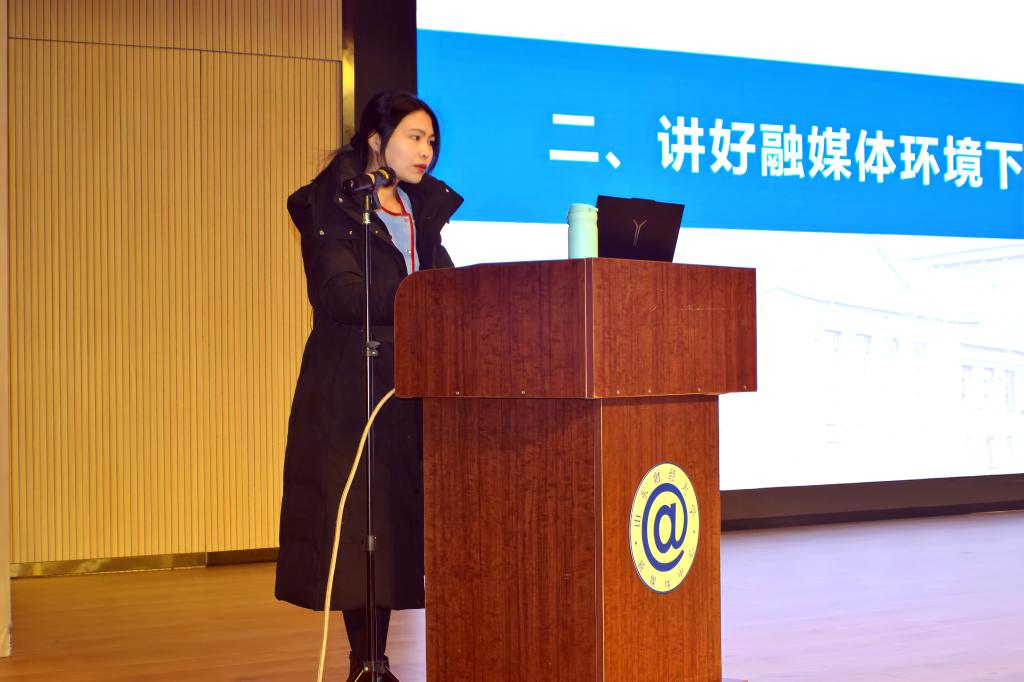 12月17日下午,党委宣传部新媒体中心在圣井校区大学生文化活动中心报告厅举办业务培训会。山东师范大学党委宣传部张莹老师应邀作题为《用好“三字诀”,推动高校新媒体守正创新》的报告。校新媒体中心和《山东财经大学报》新媒体团队共计200多人参加了培训。