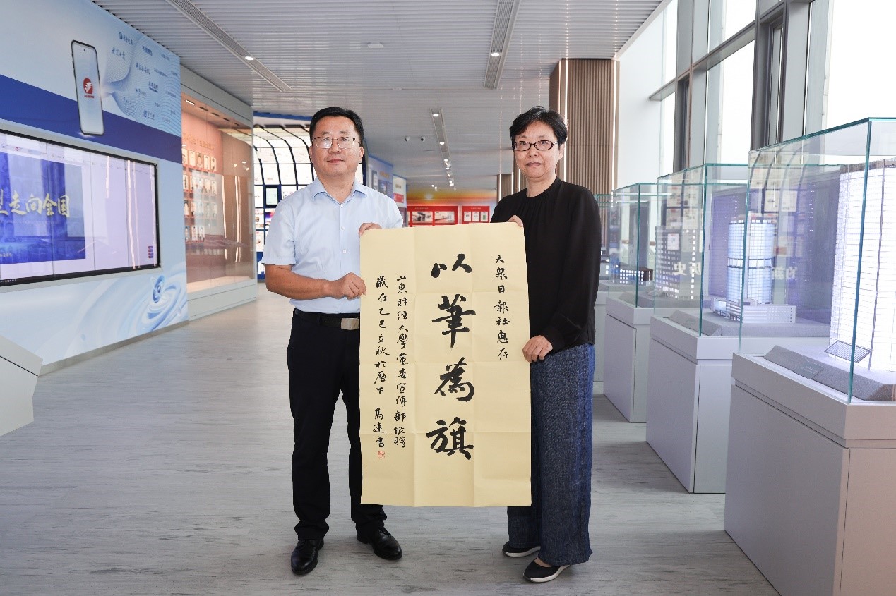 大家认真聆听讲解,驻足观看珍贵史料。参观结束时,向大众日报社史陈列馆赠送了书法作品《以笔为旗》。