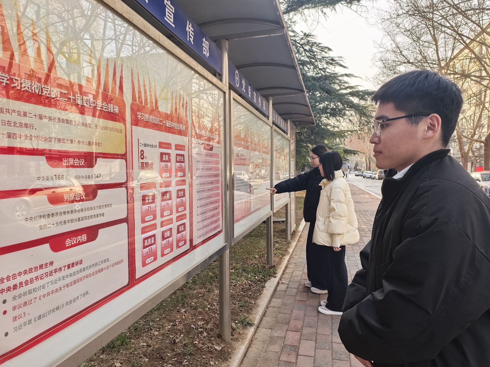宣传栏前,青年学生认知阅读四中全会图文报道