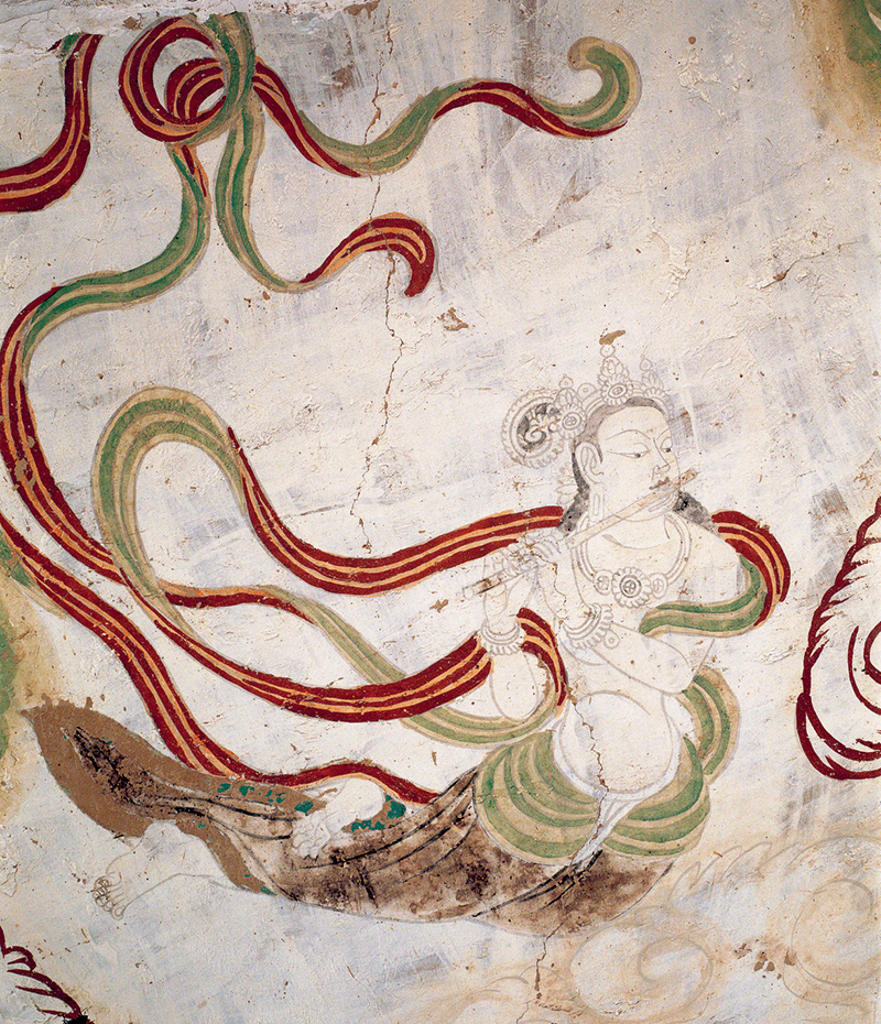 飞天是敦煌艺术的标志之一。据统计,仅莫高窟就绘有飞天约4500身之多,加上其余石窟,共计近6000身。图为榆林窟第15窟前室顶南侧的飞天。 敦煌研究院供图