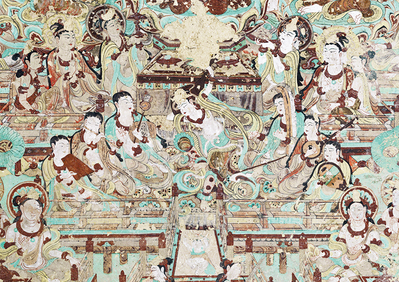 图为莫高窟第112窟南壁壁画“反弹琵琶乐舞图”。这幅壁画是多元文化交流融合的艺术结晶,鲜明体现了中华文明海纳百川、开放包容的广阔胸襟。 敦煌研究院供图