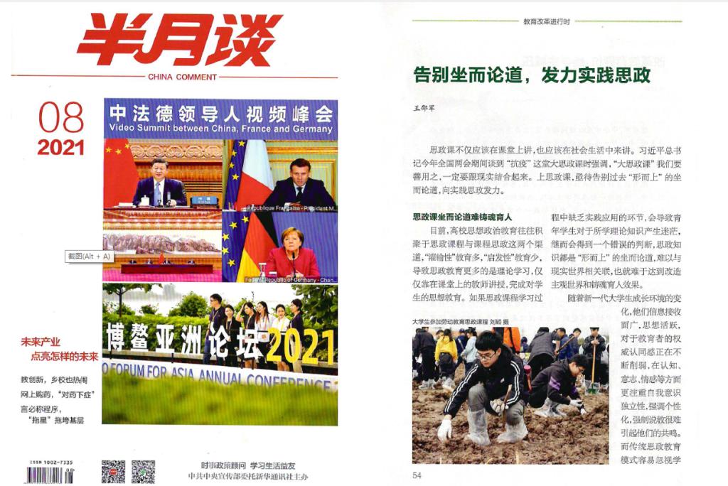思政课不仅应该在课堂上讲,也应该在社会生活中来讲。习近平总书记今年全国两会期间谈到“抗疫”这堂大思政课时强调,“大思政课”我们要善用之,一定要跟现实结合起来。上思政课,亟待告别过去“形而上”的坐而论道,向实践思政发力。