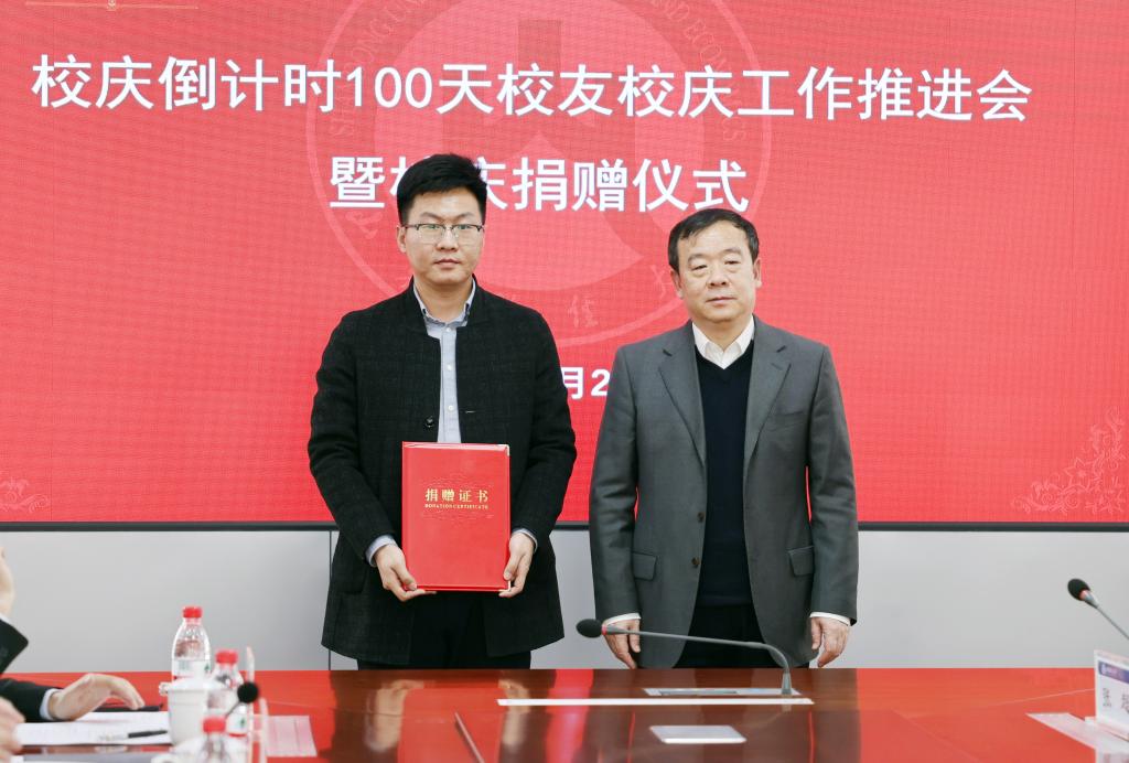 王邵军在讲话中向一直以来关心支持学校教育事业发展的广大校友、各界朋友表示衷心感谢!向捐赠嘉宾慷慨捐赠表示崇高敬意!向所有为校庆筹备工作而付出智慧和汗水的同志们表示衷心感谢!他指出,在校庆倒计时100天之际,我校教授、年轻校友,还有社会企业向学校校庆捐赠,让我们特别感动,也很受鼓舞。范正红教授艺术作品捐赠充分体现了他来校从教25年来对学校热爱之情深厚绵长,将有效助力我校文化艺术学科和专业建设;中铁建工集团山东公司捐资助力学校发展充分体现了企业的社会责任担当;李庆新校友向广大校友发起学校燕山校区文体馆捐建倡议并进行捐资,李欣、贾需校友为校庆捐资等,都充分体现了财大校友的拼搏精神和感恩情怀。