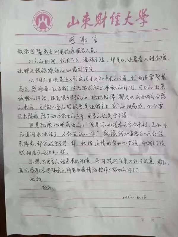 另一名学生的感谢信是用“山东财经大学”信笺纸写的,“可口的饭菜,流畅的网络,还有很多次‘妹妹好棒’的鼓励,都足以成为我安全感的来源。结束隔离时除了庆幸,更多的是舍不得……”。